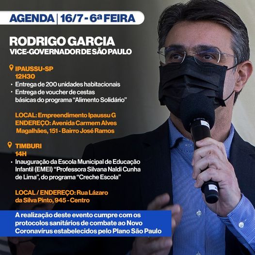 o vice governador de sao paulo rodrigo garcia juntamente com deputado estadual mauro bragato e marcos vinholi e juntamente com sua comitiva e equipe do governo estara em algumas cidades da regiao entre elas em ourinhos pra uma audiencia publica na sequencia entrega 200 casas populares do conjunto jose ramos em ipaussu e logo apos em timburi sp e o vice governador visitando as cidades do estado de sp e ouvindo as reinvindicacoes dos prefeitos vereadores e o povo das cidades