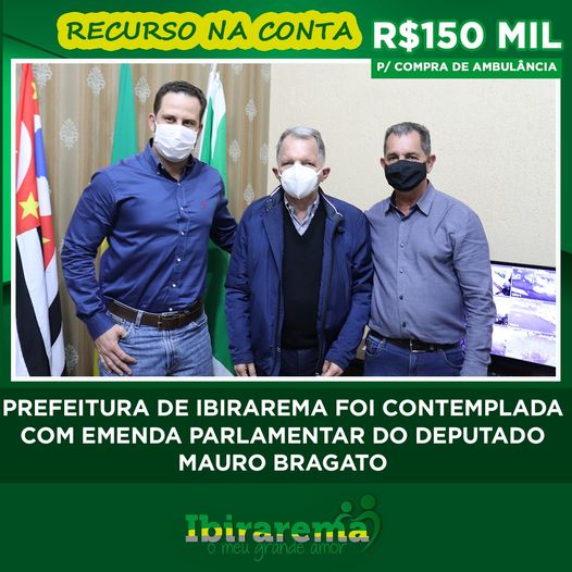 no ultimo dia 23 o prefeito camachinho recebeu uma boa noticia pra cidade 150 mil reais de uma emenda parlamentar do deputado estadual mauro bragato o valor e uma aquisicao de uma ambulancia pra area da saude e o processo esta por meio licitatorio e ja esta em andamento e o prefeito camachinho agradece o apoio do deputado por mais esse apoio a ibirarema