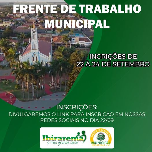 frente de trabalho de ibirarema esta novamente com inscricoes abertas entre 22 a 24 de setembro e em breve estaremos divulgando no radio e nas midias sociais se voce esta desempregado e sua chance fique atento pois tem os requisitos a serem feitos nas inscricoes pelo candidato boa sorte