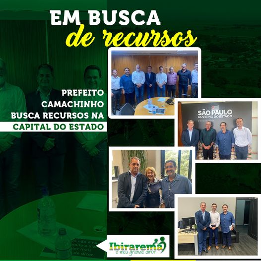 nesta quarta feira dia 23 esteve em sao paulo o prefeito municipal o camachinho de ibirarema foi obter a capacitacao de recursos pra cidade e fez varias visitas as secretarias em sao paulo na habitacao esteve com fernando cury fez solicitacoes pra mais casas populares e melhorias na praca henrique generick no detran visito jose pantano que fez o pedido de melhorias no transito recape e sinalizacao no palacio dos bandeirantes camachinho esteve na secretaria de subconvenios e fez o pedido a ivani vicentini discutindo o valor de 400,00,00 em leds e logo apos com edgar de souza que liberou um caminhao pipa e uma patrulha agricola e um caminhao de coleta seletiva pedidos atendidos atraves do deputado estadual mauro bragato que tambem foi reponsavel por toda essa agenda acompanhado do acessor adriano lopes ja o deputado estadual reinaldo alguz ja em reuniao viabilizou pra ibirarema um caminhao basculante o prefeito camachinho sempre buscando apoio a ibirarema e agradecendo o governador de sao paulo. joao doria o vice governador rodrigo garcia . e o secretario regional marcos vinholi.
